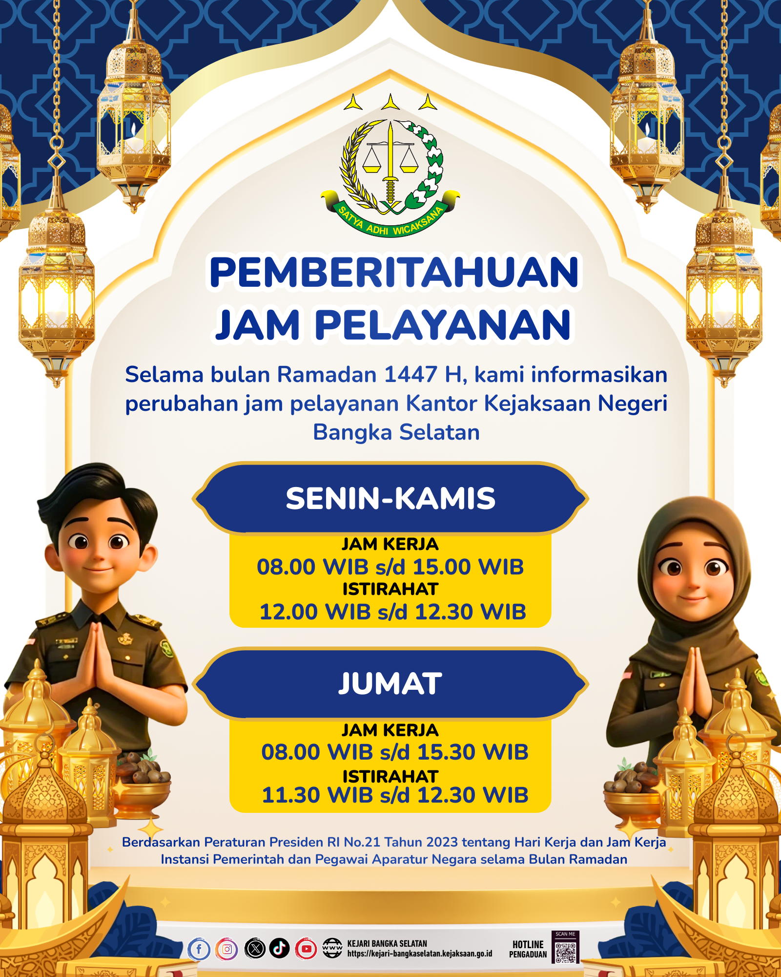 📢 PENGUMUMAN PERUBAHAN JAM PELAYANAN 📢 Dalam rangka bulan suci Ramadhan, jam pelayanan di Kejaksaan Negeri Bangka Selatan mengalami penyesuaian....